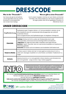 Wir legen großen Wert auf die freie Persönlichkeitsentfaltung unserer Schüler:innen. Deshalb bestehen bei uns an der Schule einige Richtlinien bezüglich der Kleiderordnung. Kleidungsstücke, Accessoires und Bemalung, die auf die Zugehörigkeit einer ideologischen Gruppe hinweisen oder Beleidigungen enthalten, sind nicht gestattet. Genaueres erläutert unser Dresscode (hier klicken).